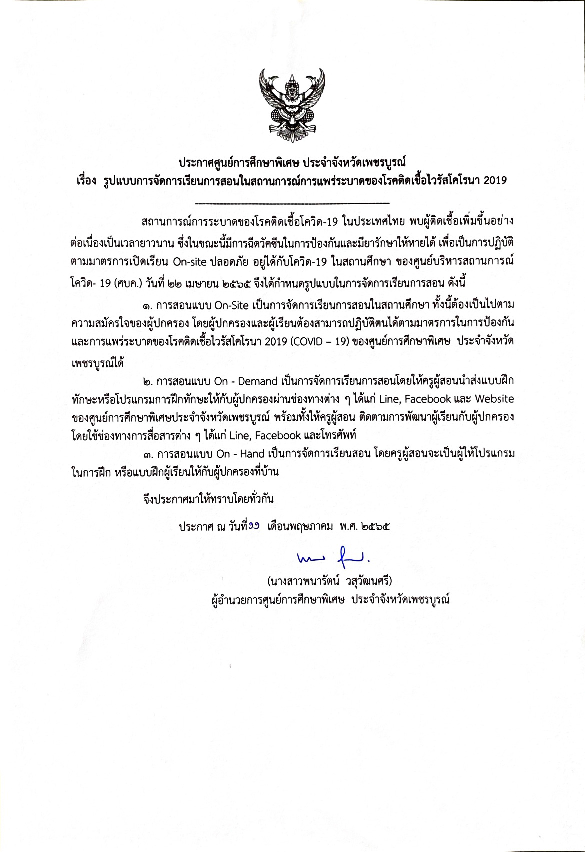 ประกาศศูนย์การศึกษาพิเศษ ประจำจังหวัดเพชรบูรณ์ เรื่อง รูปแบบการจัดการเรียนการสอนในสถานการณ์การแพร่ระบาดของโรคติดเชื้อไวรัสโคโรนา 2019